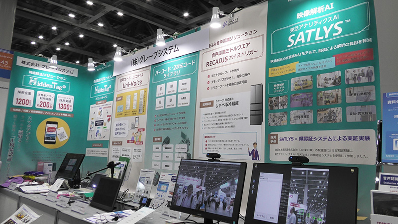 当社ブースでは、バーコード/2次元コードライブラリ、音声コードソリューション、音声認識ソリューションのご紹介をするとともに、画像認識×AIゾーンに、「SATLYS 映像解析AI」と正規品認証に役立つ真贋判定ホログラム「HiddenTag」を展示しました。