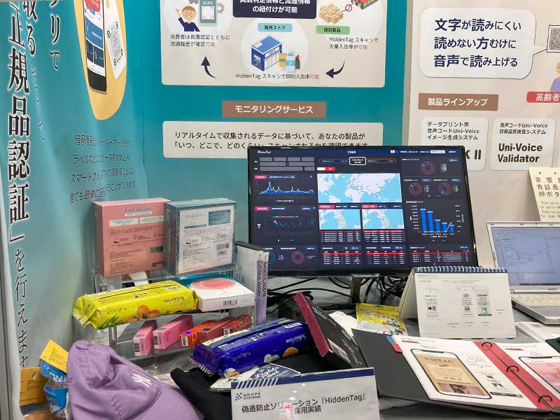ブースでは、数多くの採用事例をサンプル展示し、お手に取ってご覧いただきました。また流通管理サービスやモニタリングサービスのデモサイトをモニタに表示し、HiddenTagを使用したデータがどのように活用されているかをご覧いただきました。