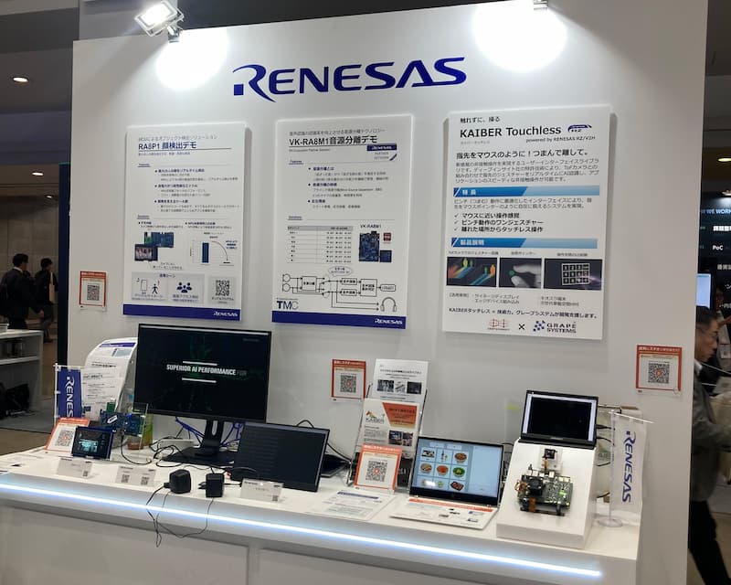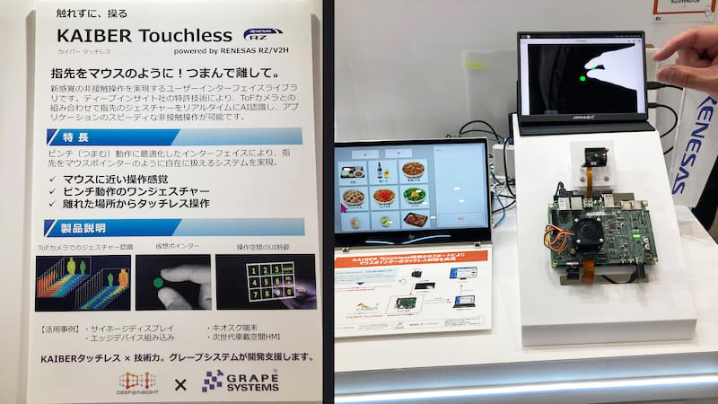 今回は、ハードウェアはもちろんソフトウェアまで実演デモで体感できる、世界有数の半導体メーカー4社が集った「小さく始めるAIパビリオン」に出展したルネサスエレクトロニクス社のデモ展示の一つとして、RZ/V2H と KAIBER Touchless を組み合わせた、タッチレスGUI(非接触操作)のデモ展示を行いました。