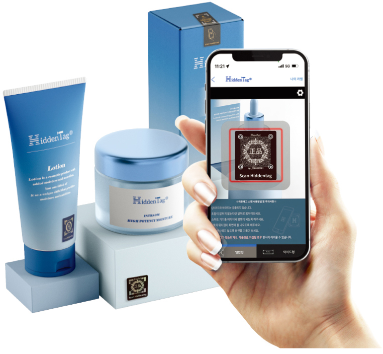 HiddenTagアプリケーションは、製品の正規品認証と偽造防止を目的としたソリューションです。 ユーザーはスマートフォンでアプリケーションをダウンロードし、製品に貼付された専用タグをスキャンすることで真贋判定が可能です。