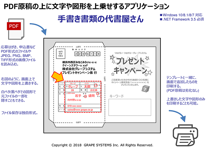 「手書き書類の代書屋さん」は、PDFや画像(印刷物をスキャン)ファイルを原稿(用紙の背景)として取り込み、文字、図形、画像を上書きして印刷するソフトです。本ソフトを使うことで、今まで手書きしていた書類をPCで綺麗に作成印刷できるようになります。
