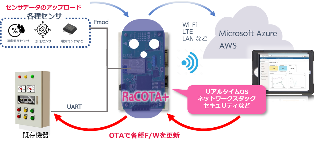 既存装置にRaCOTA+を接続することでWi-Fi、LTEなどネットワーク経由で簡単にクラウドにアクセスすることができます。また汎用I/F(Pmod)にて様々なセンサやBLEモジュール等を接続することができ、データはクラウドサービスで見える化、分析、またOTAでF/Wの更新も可能です。