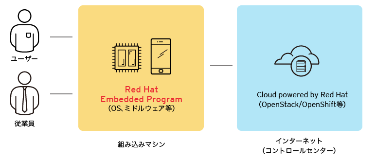 RED HAT Embedded Programは、IoTのための組込みソリューション提供イメージモデルです。エンタープライズで利用されているRed Hat Enterprise LinuxやRed Hat JBoss Middlewareなどを組込み向けに提供します。組込みデバイスやコントローラーなどのIntelligent Systemだけはなく、データセンターにおいても適用可能なプログラムです。